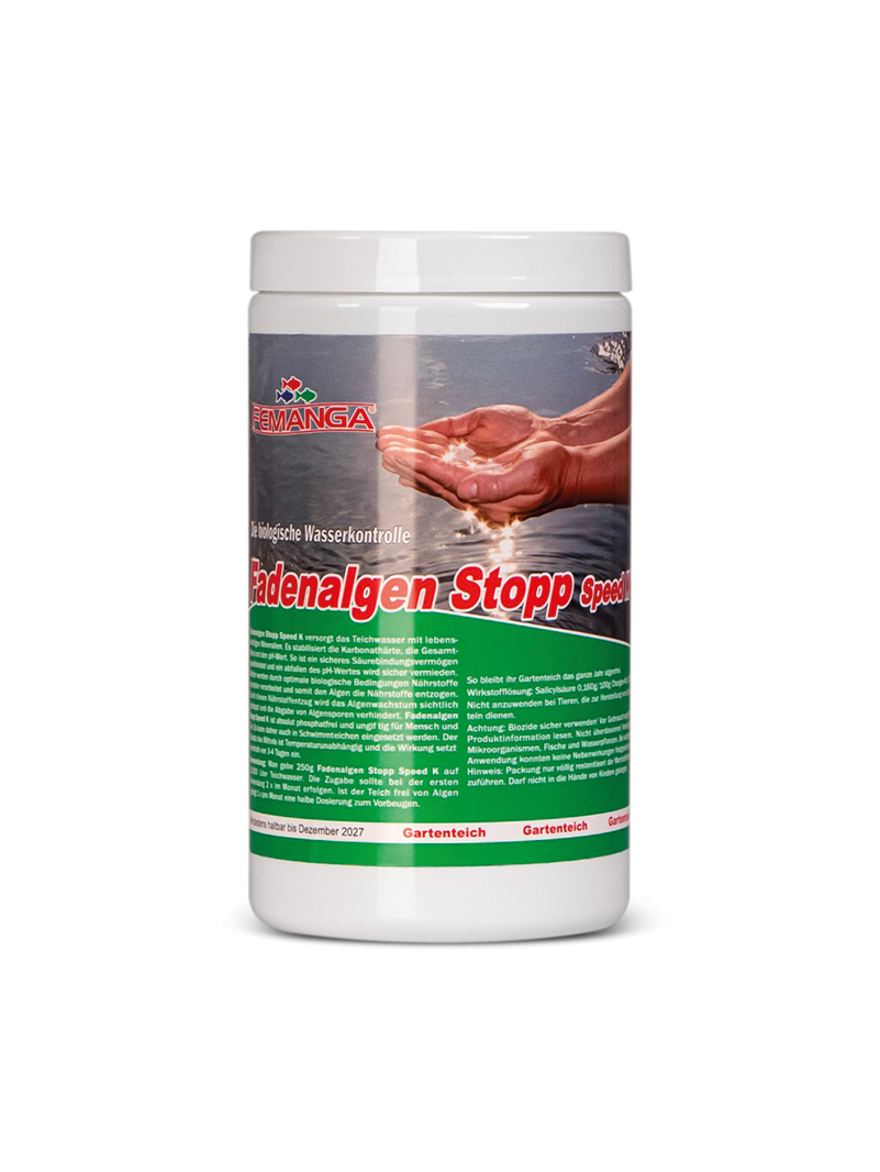 Femanga Fadenalgen Stopp Speed K to wyjątkowo skuteczny preparat, który zwalcza glony nitkowe, kożuchowe oraz inne rodzaje glonów występujące w oczkach wodnych, stawach ozdobnych i stawach kąpielowych.