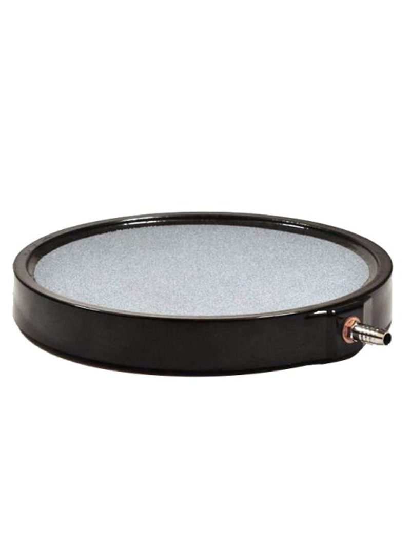 DYSK napowietrzający o średnicy 20cm i grubości 2,7cm wykonany z mieszanki bardzo drobnego piasku kwarcowego dla niezwykle drobnych bąbelków powietrza. Kamień w idealnie pasującej obudowie plastikowej pod która znajdują się cztery nóżki antypoślizgowe. Masa kamienia utrzymuje go na dnie.